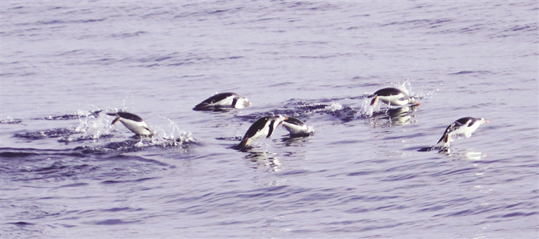 “最期待的是看到一些南极特有的生物,鲸鱼、海豹或是企鹅群。”刘文博说,有船员拍摄过一段海豹群追着磷虾群觅食的壮观场面,下饺子一样,很想亲眼看看。可惜一路都没见到大群海豹,倒是拍摄到一段企鹅群觅食的场景。那些企鹅一个个跳出海面,露出密密麻麻的白肚皮,带着莫名的喜感。他也曾亲眼见过各种海鸟密密麻麻跟着船,追逐磷虾群。鲸鱼也是常见,那些庞然大物会时而浮出海面透气,露出灰黑的脊背,十分壮观。而且鲸歌嘹亮悦耳,夜晚常伴他入眠。
