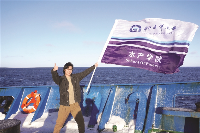 刘文博说,在这趟不可多得南极之旅中,自己看到了终身难忘的风景,也做了一些终身难忘的事,比如在南极海域脱去棉袄,站上船头,挥舞着浙海大的旗帜留影。
