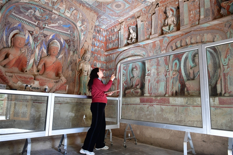 4月19日,王娇在莫高窟第259窟做洞窟记录。