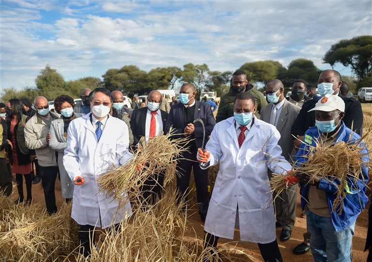 6月27日,博茨瓦纳代总统措霍瓦内(前中)在哈博罗内收割中国节水耐旱稻。