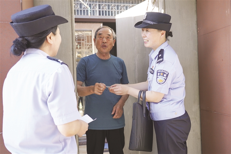 近期,普陀展茅派出所“蜂采队”巾帼文明岗民警、辅警走村入户,为辖区老人送证上门,并开展防范涉老诈骗宣传,提升老年人防骗意识。(刘宇翔)