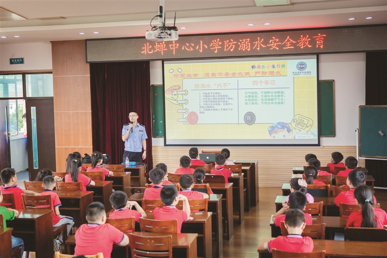近日,定海新港派出所联合蓝天救援队,走进北蝉中心小学开展“防溺水安全教育”宣传活动,进一步提高师生安全防范意识和自护自救能力。