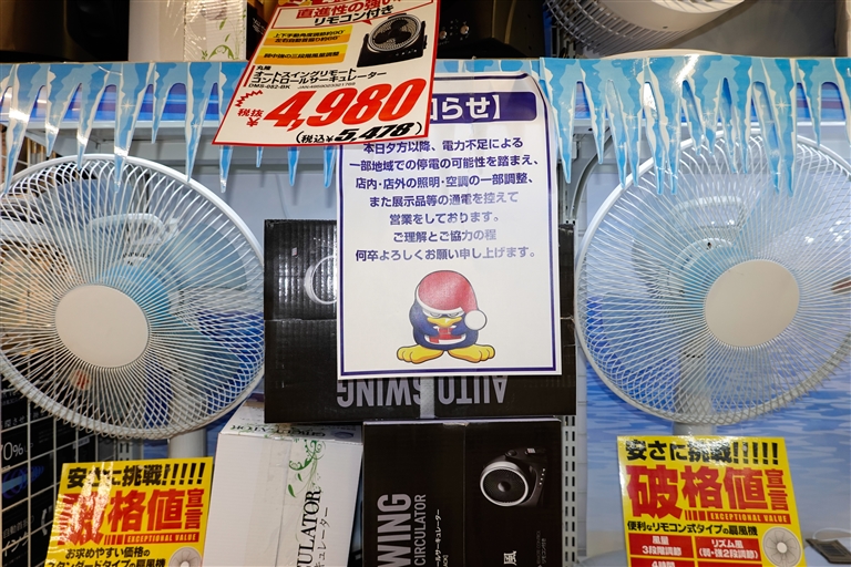 这是7月2日在日本东京目黑区一家超市拍摄的节电通知和风扇样品。受罕见高温天气及火力发电站老化等影响,日本今夏或面临持续电力供应紧张。为此,日本政府7月1日启动为期三个月、家庭和企业共同参与的全国节电季。这是日本2015年以来首次重启全国节电季。 新华社记者 张笑宇 摄