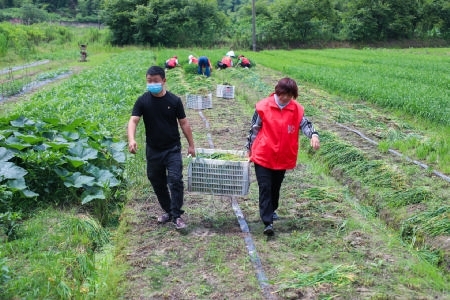 近日,定海双桥街道南山河附近,普陀徽商平安义工队的志愿者们在种植户李金龙的农田里帮忙收割韭菜,短短一上午时间,就收割了约1500公斤。