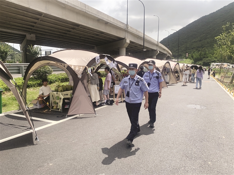 近日,定海双桥派出所民警在辖区“咖啡农夫市集”加强巡逻工作,维护市场秩序。同时,提醒市民群众提高防范意识,增强反诈能力。(顾文斌)