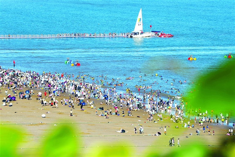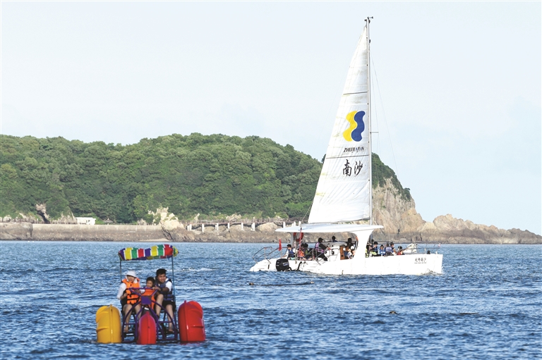 随着夏季旅游旺季的来临,素有“碧海金沙”美誉的朱家尖景区旅游业迅速复苏,游客数量稳步回升,众多游客来到海边感受碧海金沙的夏日风情。