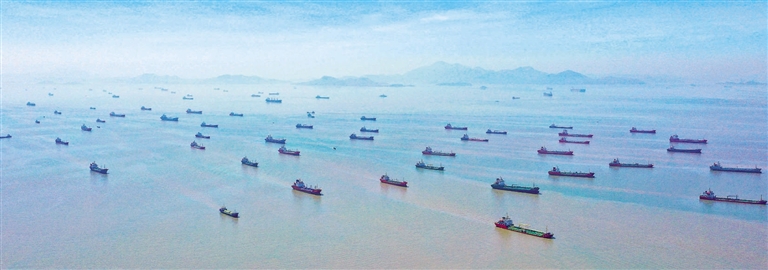 7月8日上午,舟山南部海域锚地,众多船舶有序停泊着。近年来,舟山船用燃油供应量稳步增长,如今舟山已成为全国第一大加油港。摄影 记者 张磊