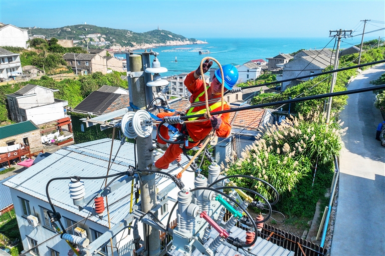 7月8日,普陀东极庙子湖岛上10千伏配网线路改造现场,电力工人正在进行架空线路落地改造。这是国网舟山供电公司补强和提升海岛电网、为东极未来海岛建设实现岛岛共富提供可靠电力保障的重要举措,也是电力线路提高防风抗台能力的有效保障。