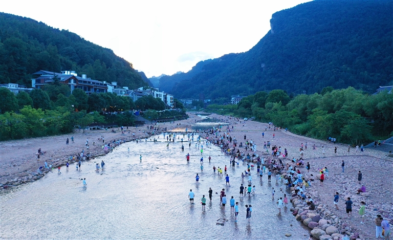 7月12日,在湖南省张家界市武陵源城区索溪河畔,人们亲水休闲(无人机照片)。