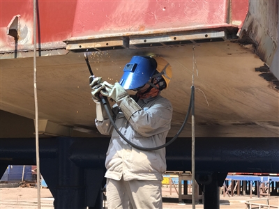 在船体下工作,虽然避开了太阳的炙烤,但焊接时的上千摄氏度高温,依旧让身着厚重防护服的刘凤霞满面通红。豆大的汗珠顺着她的额头往下流,正在专注焊接船体部件的刘凤霞却顾不上擦汗。此时,一旁的记者脸上已不断渗出汗珠。焊好一处,刘凤霞走下梯子,将梯子向旁边挪了挪,又开始进行下一处的焊接。