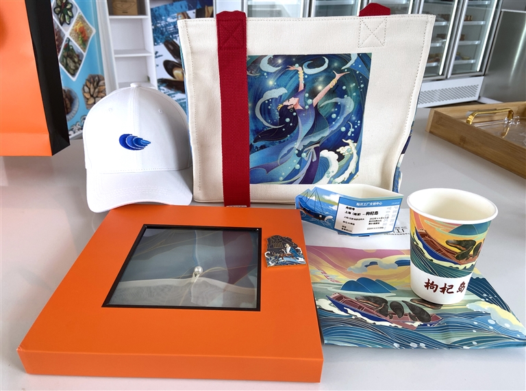 平日里,他是讲解员,为游客介绍“贻贝工厂”以及贻贝的相关知识、营养价值、神话故事与枸杞乡的贻贝养殖史等。此外,他还承包下了位于体验空间三楼集产品展示和销售于一体的休闲区。为了丰富区域内的内容,除了提供一些贻贝特色小吃外,他联合团队邀请专业插画师设计推出了“东海公主”系列产品,并注册了商标。