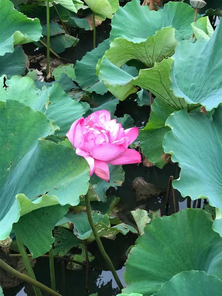 荷叶出水很高,像亭亭的少女,穿着绿色的裙子。层层的叶子中间,零零星星地点缀着粉红色的花,有袅娜地开着的,有羞涩地打着朵儿的,更像刚出浴的美少女。池中亭亭玉立的荷花姑娘正向人们展示着自己,有的自然大方,张开了粉红的笑脸;有的腼腆娇羞,“欲见游人半遮面”;有的稚嫩内敛,小脸儿捂得紧紧的、严严实实的,不肯张开;更有内向怕人的,索性躲在姐妹们的绿裙下面若隐若现……成群的鱼儿在荷叶底下游得很忘我,任何路人都无法惊扰它们。