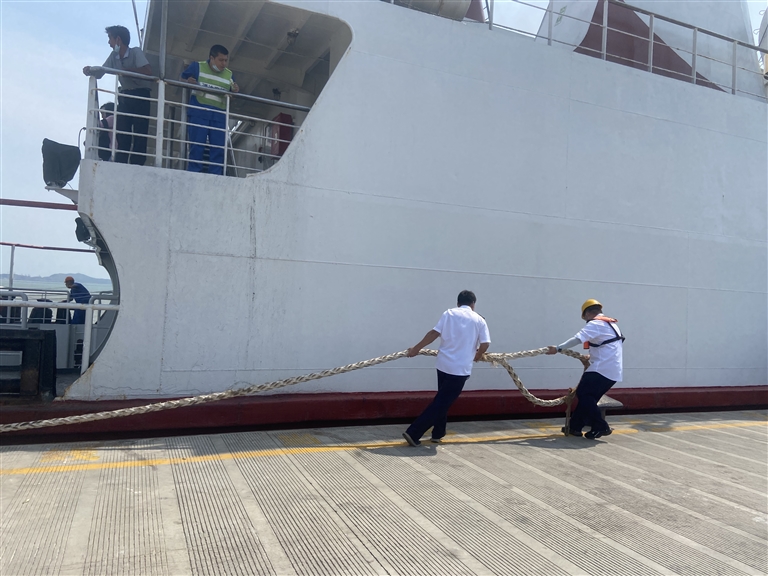 说话间,一条系有重物的抛缆绳从“通达2”号轮上扔出,落在码头边上。姚一凡立即跑过去,弯腰捡起那条细绳。船上的绞缆机隆隆作响,开始放缆绳。别看缆绳只有手腕粗细,但要用细绳拖到岸上,真不是一件容易的事。如果浸水,重量还会翻倍,单凭一名壮汉很难把它拉上岸。很快,另两名同事加入拉绳行列。“一二,三!一二,三……”三人一致将身体倾斜,做出拔河姿势,合力将缆绳头拉上岸,并快速拖行至码头最左侧的缆桩上拴住。短短两三分钟,姚一凡和同事们已是满头大汗,汗水顺着安全帽两侧的带子流下来,在安全扣上汇集并滴落。地面上,汗滴成串,又快速晒干。他们被汗水浸湿的白制服也已紧紧贴住了身体。