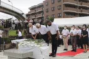 7月17日,在日本神奈川县藤泽市的聂耳纪念广场,日本民众在聂耳纪念碑前献花并鞠躬。