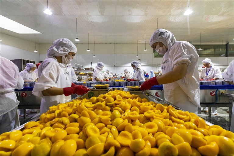 目前正值黄桃上市旺季,湖北省宜昌市秭归县将当地丰收的黄桃加工成罐头,出口到海外市场。近年来,该县采取“龙头企业+基地+合作社+农户”方式发展黄桃产业,农民将收获的黄桃直供企业进行深加工销售,帮助农民增收,促进乡村振兴。 新华社 发(聂爽 摄)