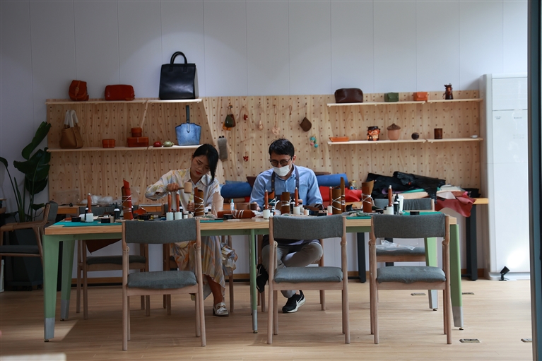 掐丝、剪丝、上胶、着色……画板上,柔软的铜丝掐成花纹,一幅绚丽的作品慢慢呈现。每到周末,“心忆空间”文创集市总会迎来一拨拨体验掐丝珐琅工艺与皮具制作的亲子家庭。该集市占地面积约740平方米,投用之初就引入第三方运营。