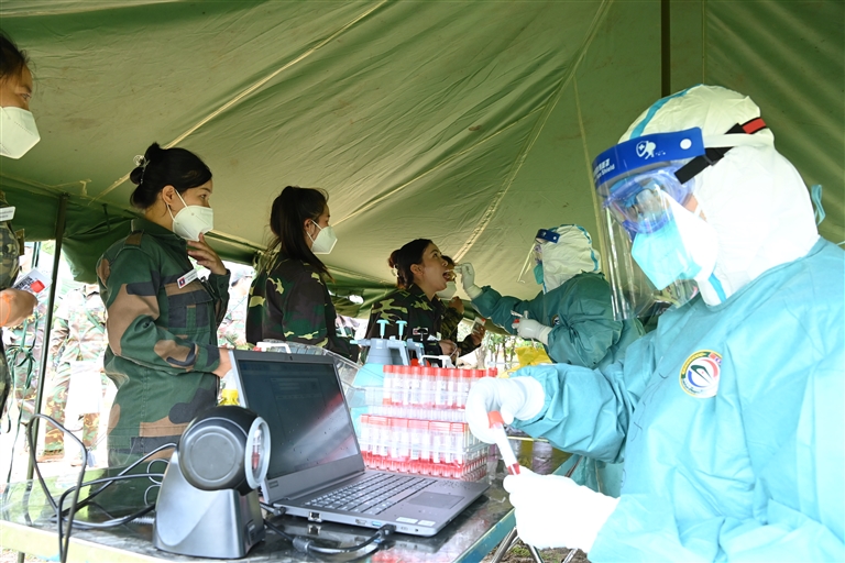 7月23日,在老挝万象省,中老“和平列车-2022”医疗队解放军疾病预防控制中心人员为参演人员进行核酸采样。中老“和平列车-2022”医疗队23日在老挝万象省进入第一次预演,我军医疗队疾控感控组同步展开联合传染病防控演练。 新华社 发(曾理 摄)