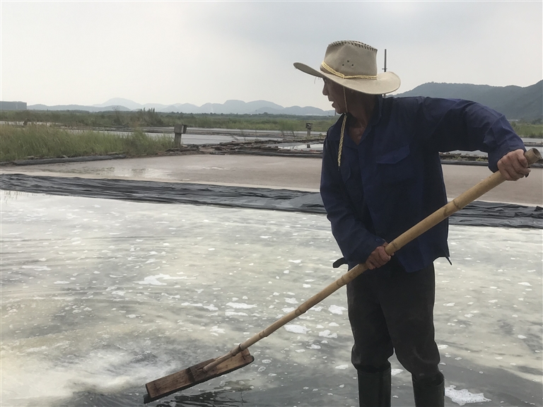“这个叫做‘打花’,这样做一方面可以把粗盐结晶打散,获得质地更细腻的盐粒,另一方面通过搅动可以防止大颗的盐粒‘钉’在水底。”杨冠达说,晒盐先要在涨潮时将海水引进盐田,再经过10天左右的“打花”,盐粒才会从海水中析出。