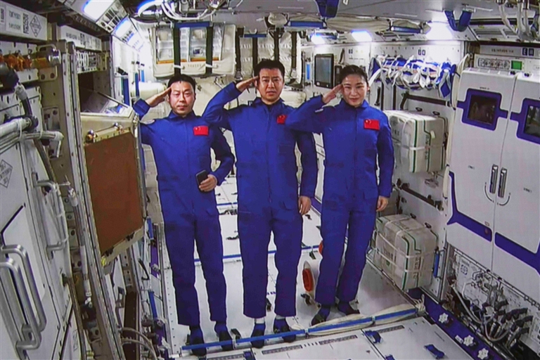 7月25日在北京航天飞行控制中心拍摄的神舟十四号航天员乘组进入问天实验舱。航天员陈冬(中)、刘洋(右)、蔡旭哲进入问天实验舱。据中国载人航天工程办公室消息,神舟十四号航天员乘组于7月25日10时03分成功开启问天实验舱舱门,顺利进入问天实验舱。这是中国航天员首次在轨进入科学实验舱。