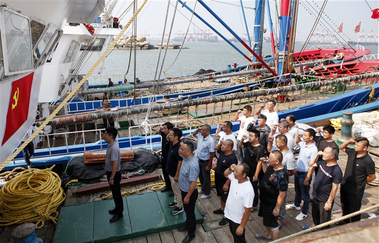 7月24日,嵊泗县洋山镇的19名渔民党员在鲜艳的党旗下重温入党誓词。当日,该镇组织渔民党员开展了“党建引领产学研,共同富‘渔’立潮头”主题党日活动。其间,向渔民党员学习宣讲省第十五次党代会精神,介绍了海上“红色网格”,并对即将出海生产的渔民党员进行了海上生产、航行等安全教育。