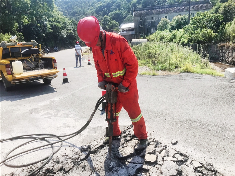用切割机划好了施工范围,凹陷处的旧沥青要全部用液压镐铲起来。机器开始上下晃动,郑祖康全身也随之抖动起来,在液压镐的作用下,路面仿佛一块松软的土地,很快被翻成了一块块黑色碎片。关掉机器,郑祖康的手却依然在颤抖,这台液压镐足足有30公斤重,擎着它震动几十分钟后,双手早已震麻了。
