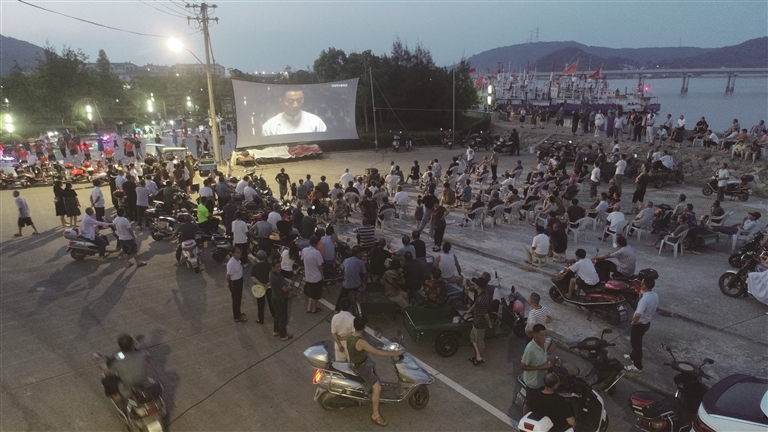 “八一”建军节前夕,普陀区六横数字电影流动放映队在台门渔港边,露天放映彩色宽银幕故事片《建军大业》,吸引了几百名渔区干部群众前来观看。