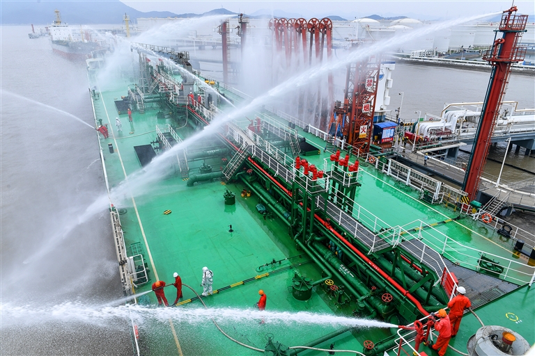 发生“险情”后,油轮上的消防水枪、码头上的消防水炮齐发力,“险情”被迅速化解 摄影 记者 沈磊 通讯员 华志波
