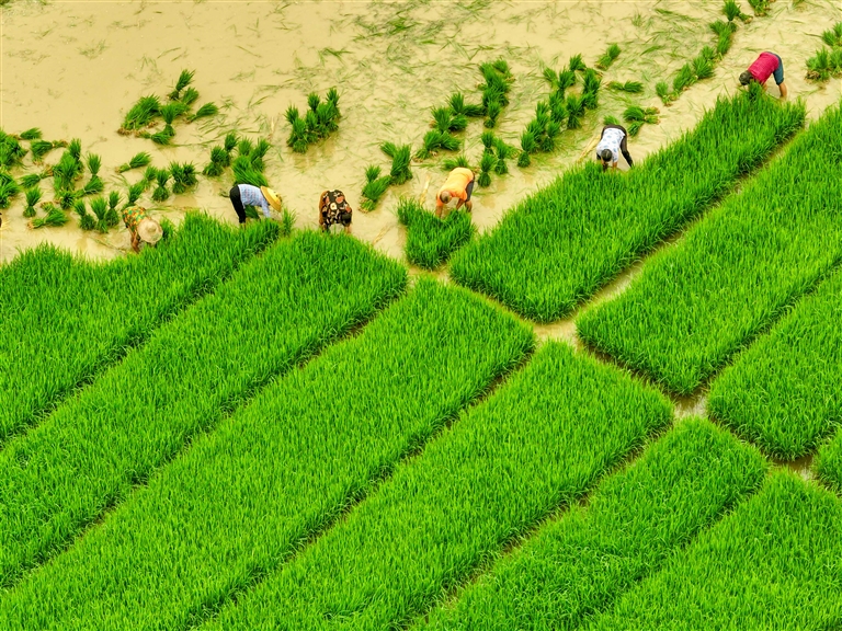 8月5日,在湖南省永州市道县寿雁镇玉蟾岩稻作文化园,农民在起获晚稻秧苗(无人机照片)。
