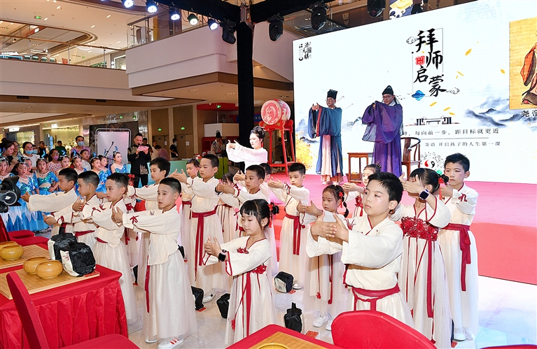 拜师听教训、收帖学礼仪、对弈识棋谱……身着古风服饰的孩子们,仿佛走进了古代围棋学堂。8月5日晚,定海区围棋协会在新城某商场举办2022传统文化围棋展演活动,吸引众多市民和青少年驻足观看。摄影 记者 沈磊
