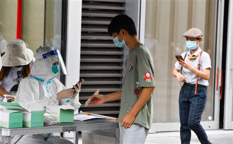 8月7日,居民在海口市龙华区万象城采样点登记信息。
