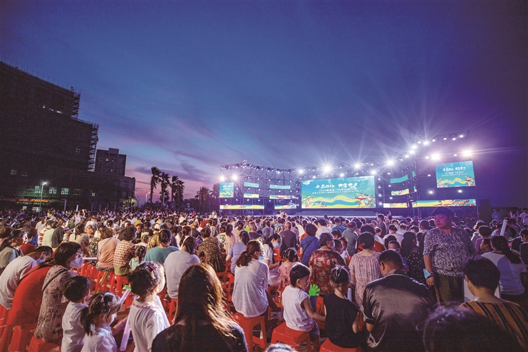 本报讯 海风吹拂,星月当空。昨晚,嵊泗县菜园镇望海广场,近2000名当地观众在欢笑中欣赏了一场全部由他们街坊邻居参演的“小岛你好、共富共美”文艺晚会(见图)。