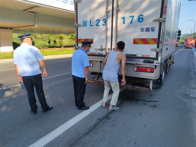 6时50分,一辆牌照为“浙L23176”的货车从匝道驶出,在沥青路面上留下一道深色的轨迹。交警立即要求驾驶员靠边停车接受检查。