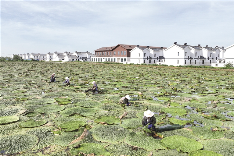 8月13日,在江苏省淮安市洪泽区岔河镇,农民在采收芡实(无人机照片)。 新华社 发(万震 摄)