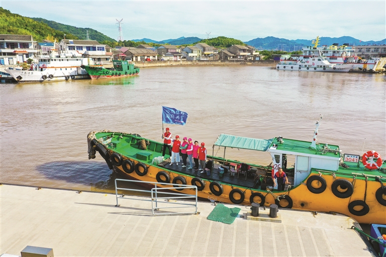 8月10日上午,“小岛你好 海岛共富”美之声服务队的志愿者乘小船来到定海环南街道小盘峙岛。