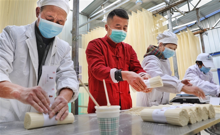 李长满(左一)在包装成品空心挂面(3月18日摄)。