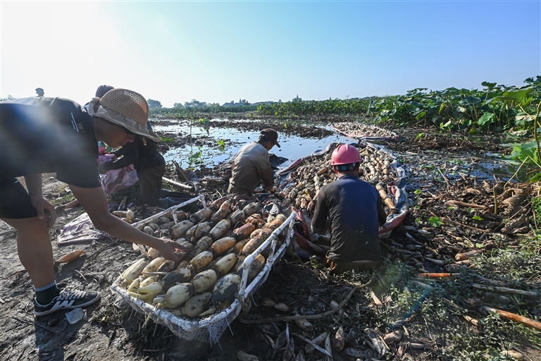 近日,浙江省湖州市吴兴区东林镇的莲藕种植户迎来了莲藕丰收季,每天有上千斤新鲜脆藕从藕塘里采收上来,销往各地市场。