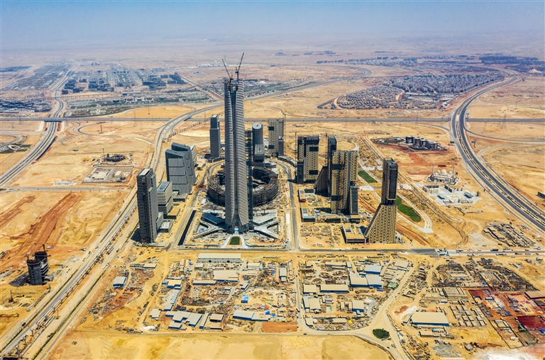 这是2022年7月19日拍摄的埃及新行政首都中央商务区项目(无人机照片)。埃及新行政首都中央商务区项目总占地面积约50.5万平方米,包含20个高层建筑单体及配套市政工程,由中国建筑股份有限公司埃及分公司承建。 新华社 发(中建埃及 供图)