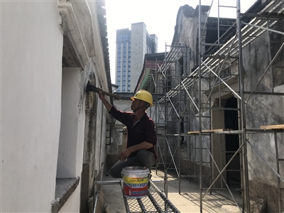 施工现场,身形消瘦、头戴安全帽的古建筑修复工汪立明,正拿着用笋皮制作的刷子,小心翼翼地对墙面进行涂抹着色(见图)。汪立明面前这桶黑乎乎的涂料,由墨汁、树皮汁等调配而成,在光照下,蒸腾起白色的水雾,散发出淡淡的油墨味道。