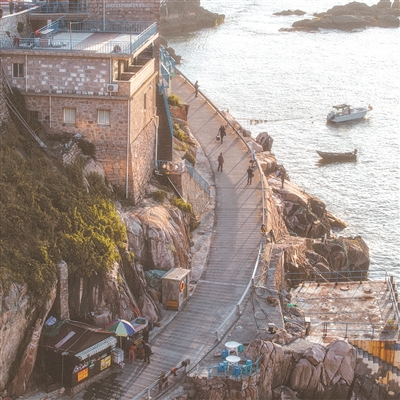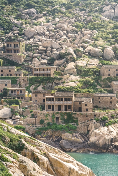 除却这些嶙峋怪石,更多石头被广泛运用于当地人的生活:将坚硬的花岗岩凿开,制成用于铺设环岛道路的石阶,修建观景的石栈道、石亭,此外有石井、石晒场、石墙,小明还曾在山顶某处草丛里,发现了一副石头砌成的棺材。若论及东福山人对石头的运用最淋漓尽致的表现,无疑是那一栋栋依山而建的石屋。
