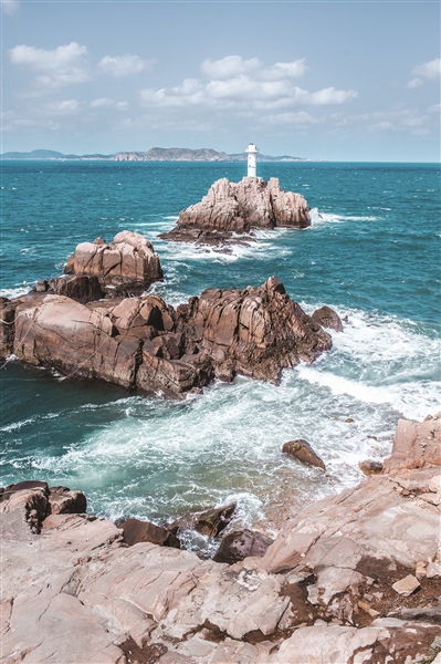 第一次去东福山,最令小明感到震撼的一幕是“开船一个小时左右,海水逐渐由黄变蓝”,渡轮在碧蓝的海面劈出一拨接一拨白色浪花,直至见到远处礁石上伫立着“东海第一哨”的白色灯塔,它指引着渡轮缓缓向前,停泊在东福山的码头边。这是一座山石垒起的岛,终年不息的风送来了一批批登岛人: 起初是摇着橹、寻找新居地的温州人和宁波人,他们从沈家门出发,一路寻至这座小岛,丰富的海洋资源让他们决定在此落脚,用山石及泥土来筑屋。