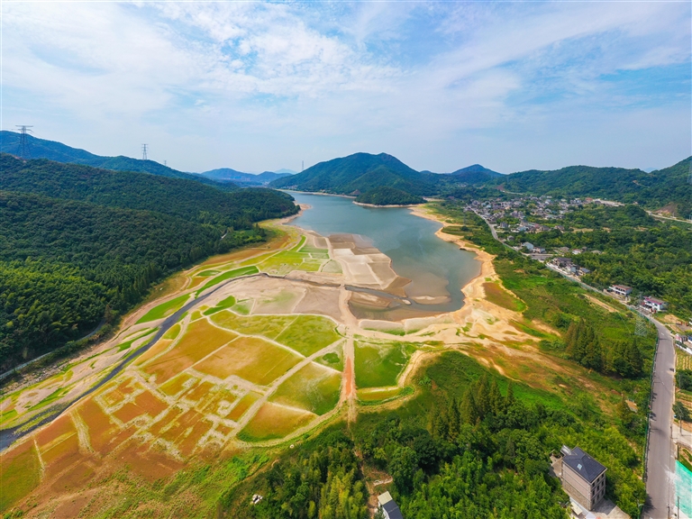 近日,定海虹桥水库水位下降明显,成片的干涸区域宛如“草原”。市水利部门呼吁全体市民节约用水,珍惜每一滴水,提高用水效率。摄影 记者 张磊