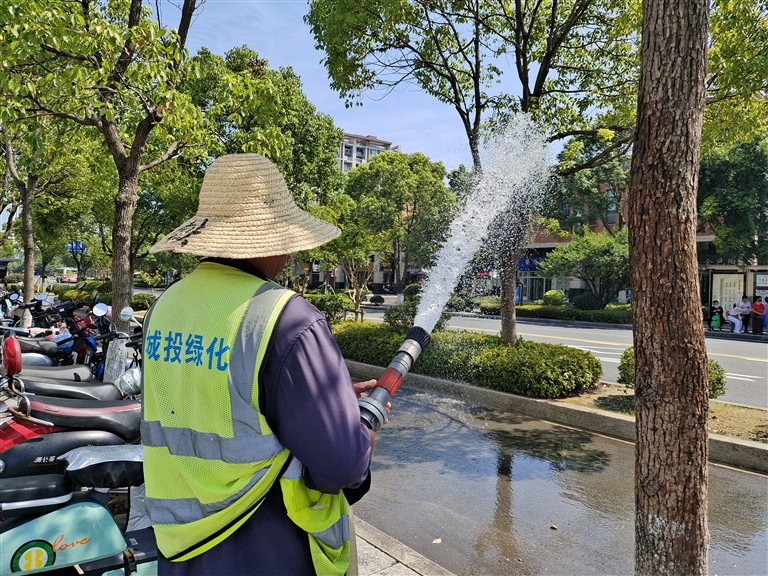 高温天气持续,连日来,市政园林工人日夜奋战,加紧为城区各绿化带浇水,力保花草苗木安全度暑。摄影 通讯员 胡社友