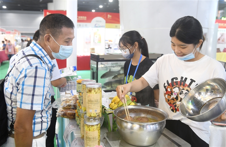 8月26日,参展商在广州博览会乡村振兴展上烹饪、展示自家农产品。当日,第30届广州博览会在中国进出口商品交易会展馆开幕。本届博览会包括3个综合展、4个专业展及1个专展,其中,乡村振兴展的展览面积约2万平方米,主要展示、销售广州和全国各地的名优农产品和食品,让大湾区优质农产品走出去、外地优质农产品引进来,用展销的形式帮促助力乡村振兴。 新华社记者 卢汉欣 摄