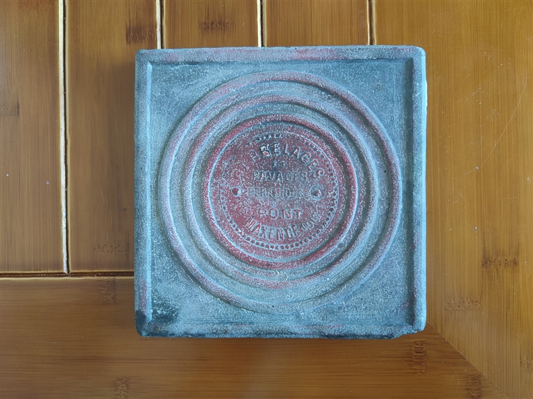 灰色的方砖上有三个红圈,最中间自上而下标有5行英文,依稀能辨认出“PAVAGES”“PONT”“MAXENCE”等单词。“这是我爷爷当年救英军的时候,对方赠送给他的礼物。一共有2块,还有一块我大哥收藏着。”严亚君对记者说。