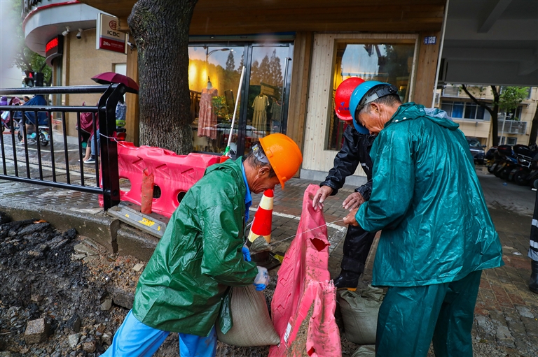 受台风“轩岚诺”影响,岛城将迎来强风暴雨。昨天下午,定海环城北路道路施工区域,工人们正用沙袋加固水马围挡,同时扎紧围板、棚架等易被风吹动的搭建物。