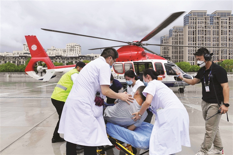 “直升机来了!”昨天11时35分,一架从嵊泗县枸杞乡起飞的直升机,在舟山医院的停机坪缓缓降落。舱门一开,一名男性患者吊着点滴,在多名家属的搀扶中走下直升机。同时,等候在旁的救护人员迅速推着担架床上前接应,将患者送往急诊室治疗(见图)。