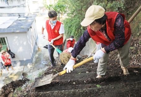 昨天,定海区昌国街道虎山社区组织“阿拉扫帚队”志愿者,在白虎山新村开展台风后小区外环境集中整治活动,清理边坡步道上的枯枝落叶以及小区卫生死角。