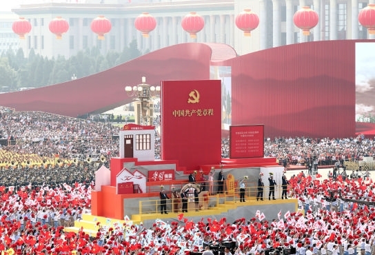 2019年10月1日上午,庆祝中华人民共和国成立70周年大会在北京天安门广场隆重举行。这是群众游行中的“从严治党”方阵。 新华社记者 兰红光 摄
