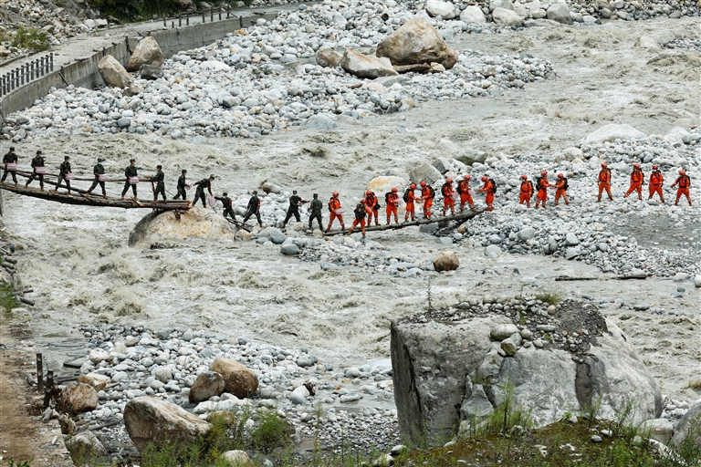 9月8日,在四川省甘孜州泸定县磨西镇附近,救援人员站在临时架设的小桥上向河对岸的村民运送生活物资。