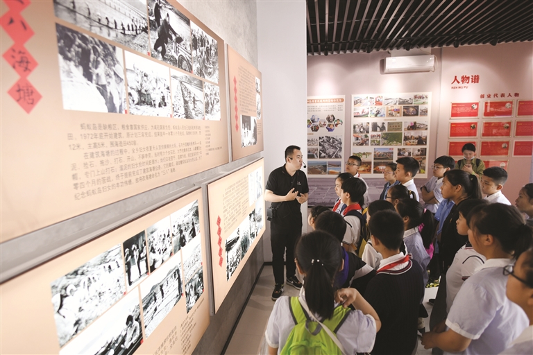 学生在创业纪念室聆听蚂蚁岛的奋斗历程